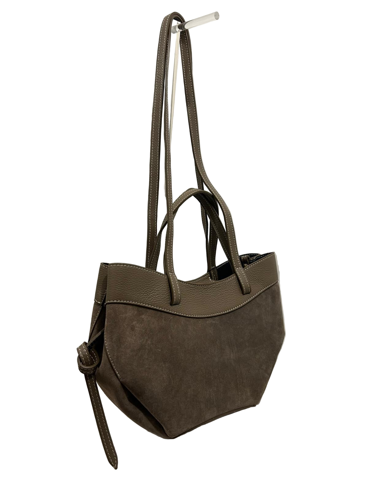 Borsa in vera pelle artigianato fiorentino. Doppio pellame: bottalato e camoscio con possibilità di chiuderla ai lati tramite bottoni. All’interno è presente uno svuota borse estraibile. Taglia S/M