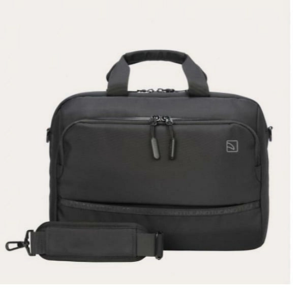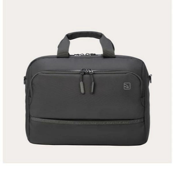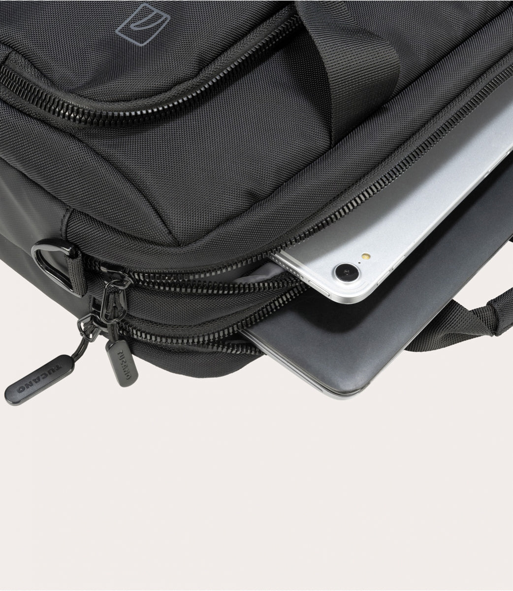 Borsa per laptop 15.6" e MacBook Pro 16" realizzato in tessuto ottenuto dalla plastica riciclata. 2 scomparti separati , 1 tasca frontale zippata e una tasca posteriore zippata .