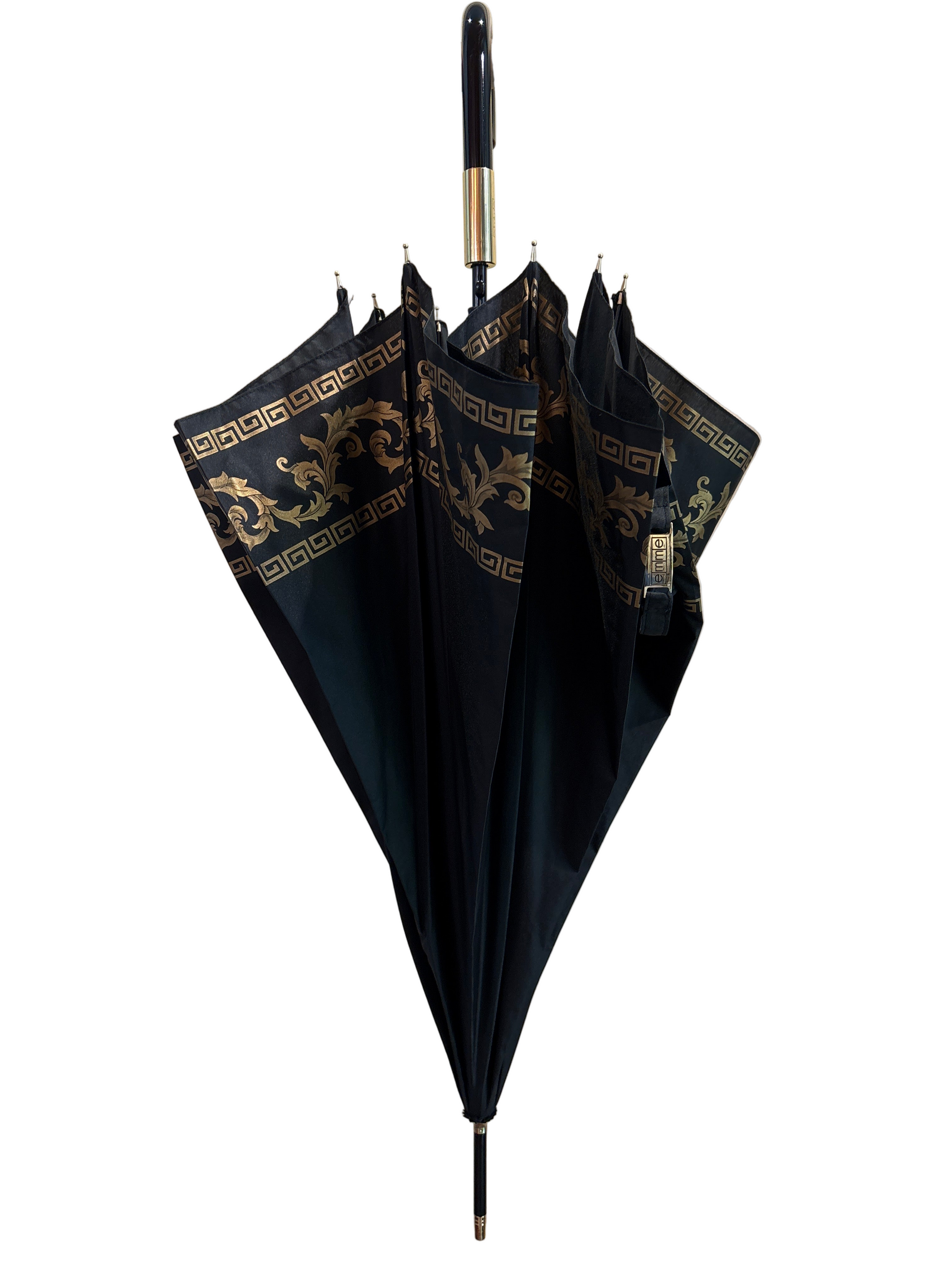 Ombrello donna lungo, fondo nero e stampa oro, manico laccato nero e oro, struttura antivento. Lunghezza cm 88, diametro cm 105
