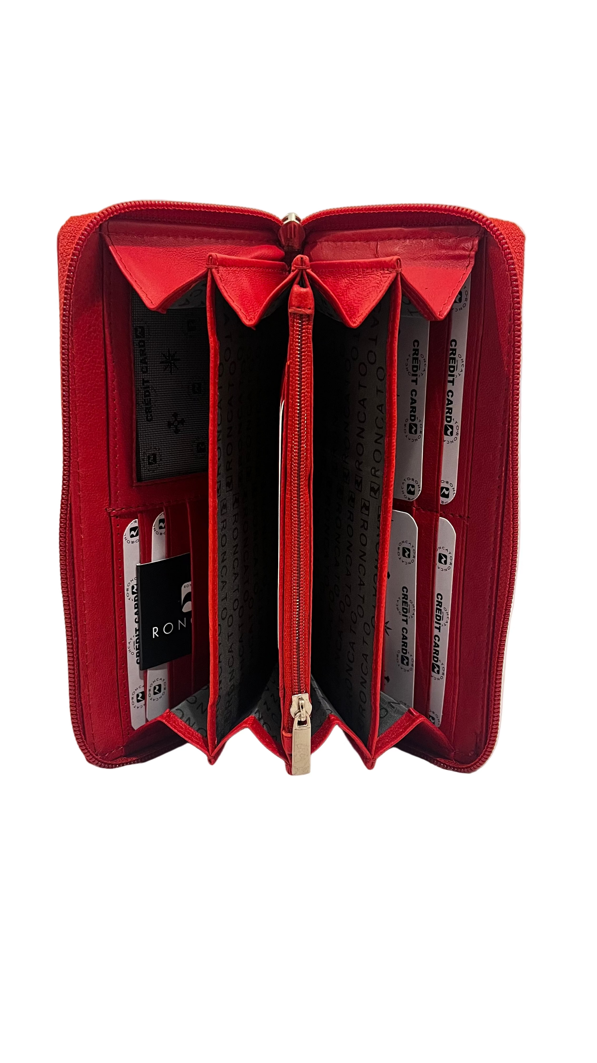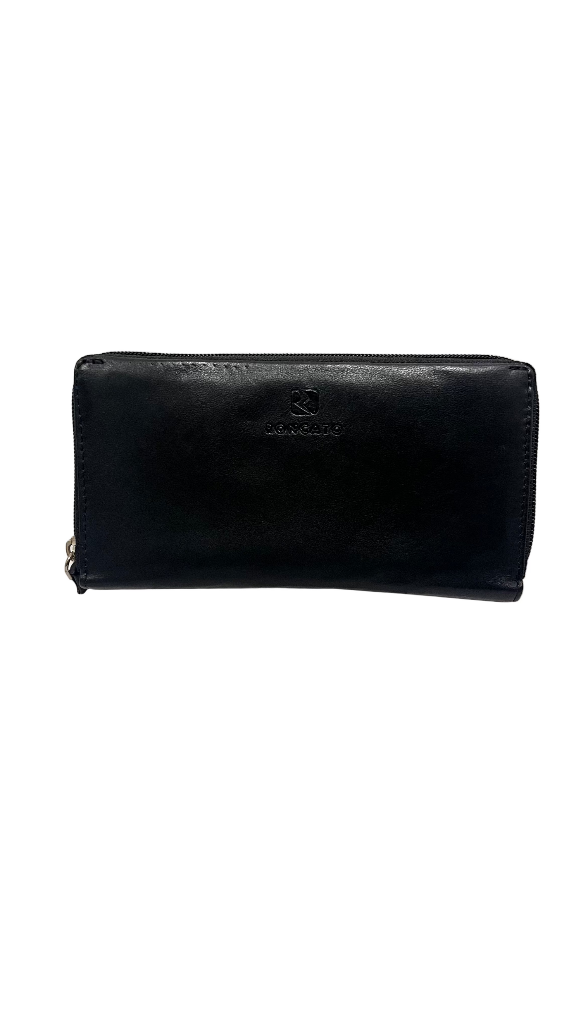 Portafoglio in pelle donna Roncato. Zip superiore con 3 scomparti separati e portamonete, zip esterna grande. Larghezza 20cm, altezza 10cm