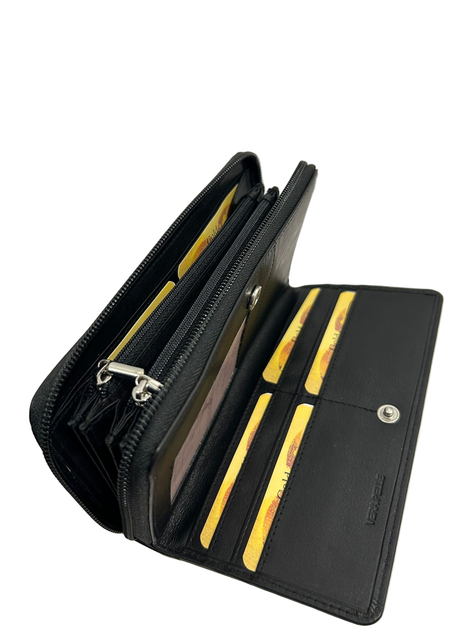 Portafoglio in pelle donna diviso in due scomparti zip e bottone, con zip portamonete e banconote. Misure
