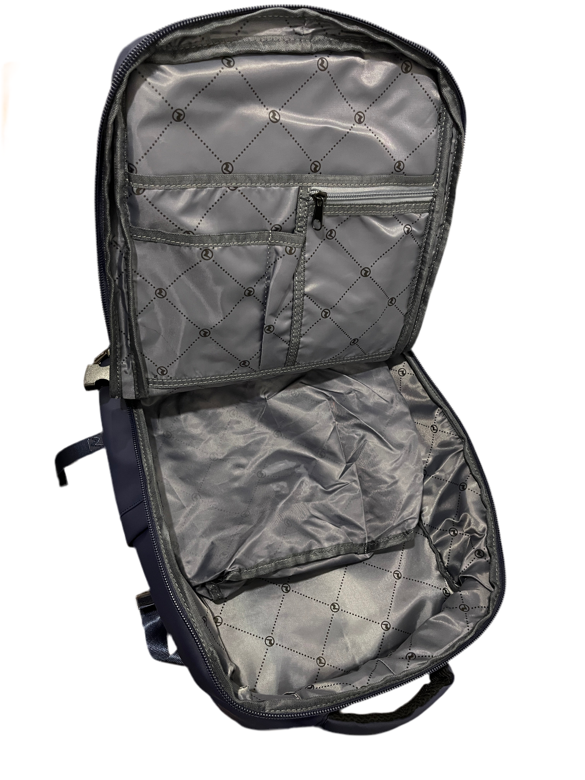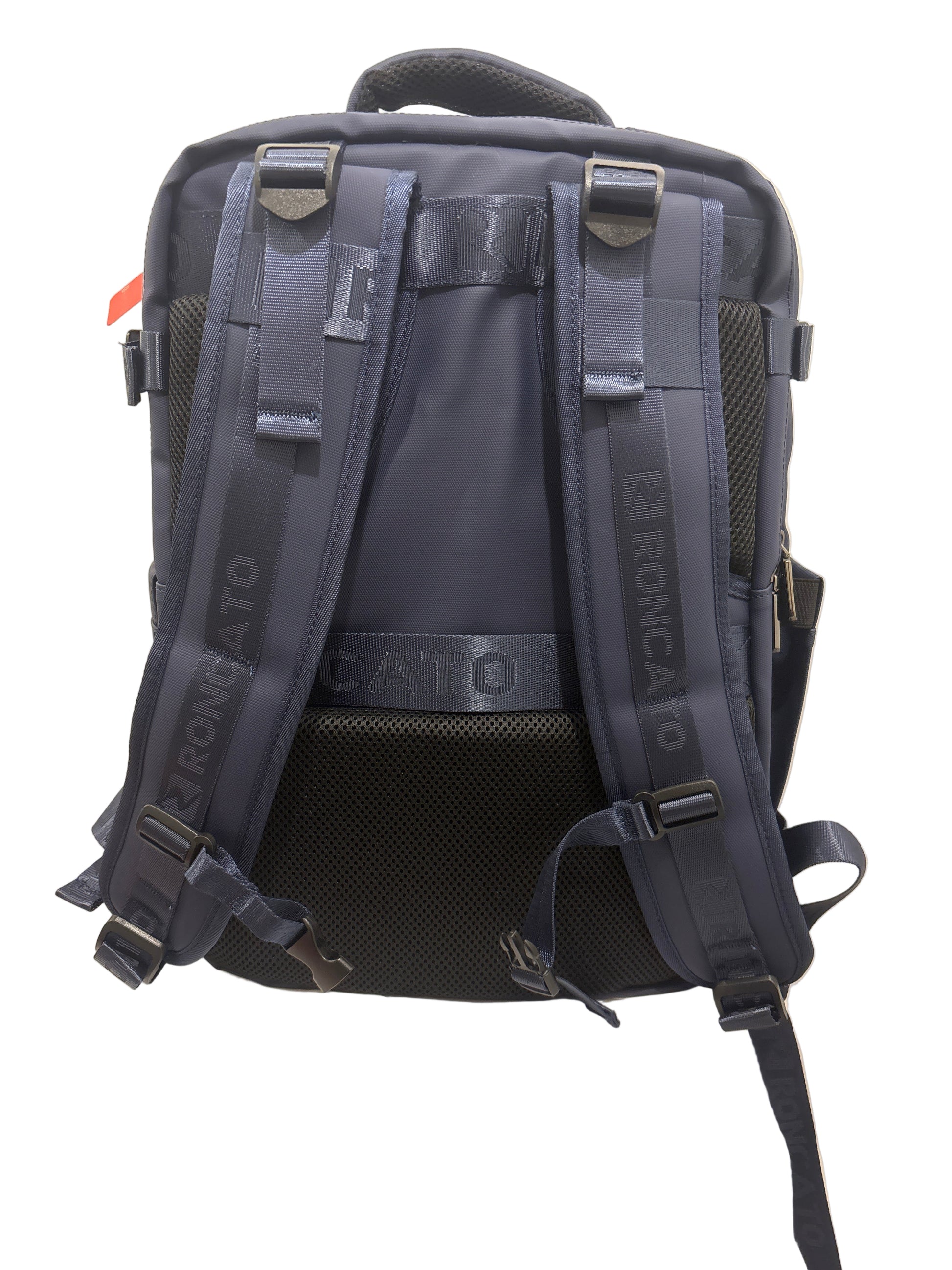Zaino sotto sedile in cordura e nylon gommato cm. 40x30x20. Ampia apertura a valigia , 1 tasca frontale , 1 scomparto porta pc, 1 tasca di sicurezza posteriore, tasca inferiore porta scarpe, attacco per il trolley